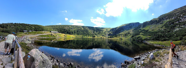 Dzień szósty, czyli 5 sierpnia 2022 r. w całości poświęciliśmy na wejście na Śnieżkę (1603 m n.p.m.) w Karkonoszach, która w naszym głosowaniu wygrała z Błędnymi Skałami, czy też Szczelińcem Wielkim (na Góry Stołowe przyjdzie jeszcze czas). Zastanawialiśmy się, którym szlakiem ruszyć, zakładając początek trasy przy Świątyni Wang, niebieskim - tym najbardziej popularnym, czy żółtym - tym, który wg turystów jest najpiękniejszą odsłoną Karkonoszy. Ostatecznie skończyło się, że poszliśmy tym najbardziej popularnym, czyli niebieskim przez Polanę, Samotnię i Dom Śląski. Początkowo wprawdzie skręciliśmy trochę na szlak żółty, ale po chwili ten ponownie połączył się z niebieskim i tak już zostaliśmy. W drogę ruszyliśmy o godz. 13.00, kiedy termometry wskazywały 32 st. C., na Śnieżce było zaś 24 st. C. Z odpoczynkami, zdjęciami, ze zjedzeniem ciepłego posiłku, z możliwością przebywania po stronie Czeskiej, całość ("wte i wewte") zajęła na tylko 6 godzin, a zrobiliśmy (każdy z osobna) 27 500 kroków. Świątyni Wang, Schronisk i Śnieżki nie będę opisywał, bo jest tego pełno w internecie. Sam szlak jest dość prosty, a jedynie atak szczytowy z Domu Śląskiego wyzwala zadyszkę.